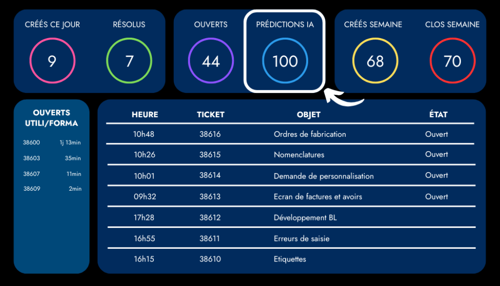 Cette analyse IA permet d’anticiper les pics de charges afin d’optimiser le management de l’équipe support et garantir une qualité de service et des temps de résolution au plus juste. Notre équipe est donc plus réactive et encore mieux organisée pour traiter les demandes ! La progression et les changements apportés se verront sur le tableau de bord qui guide leurs journées :